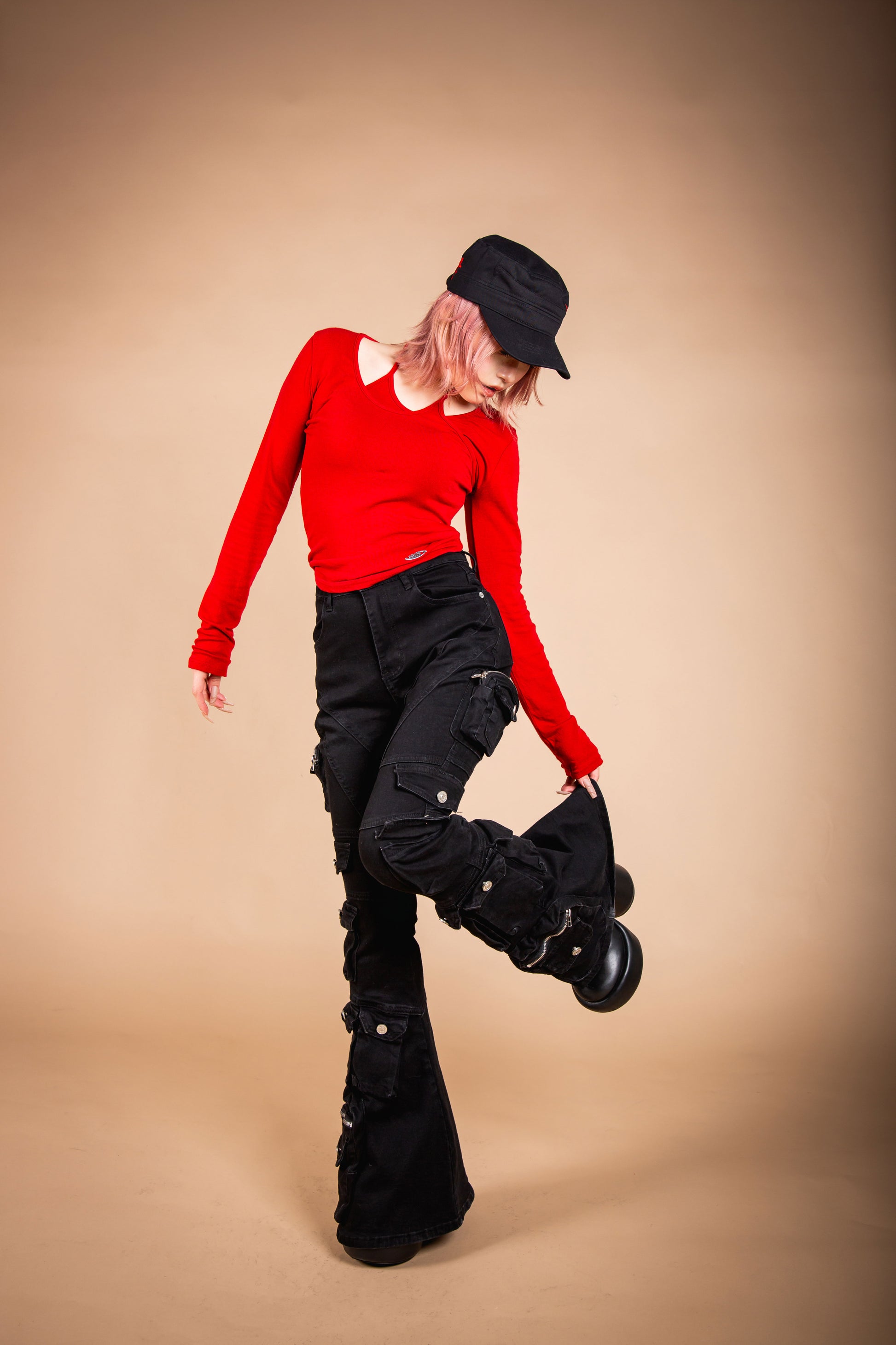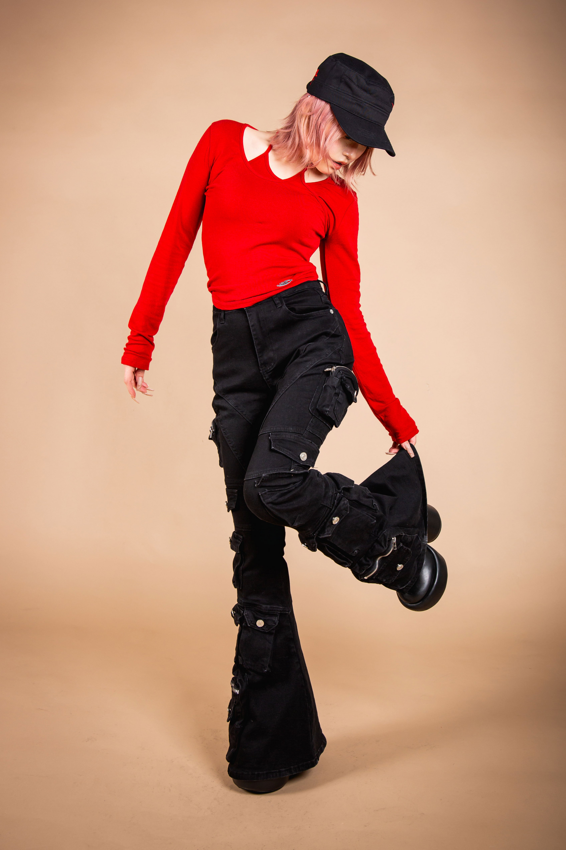 脚を長く見せるフレアシルエットと全体に施されたポケットが